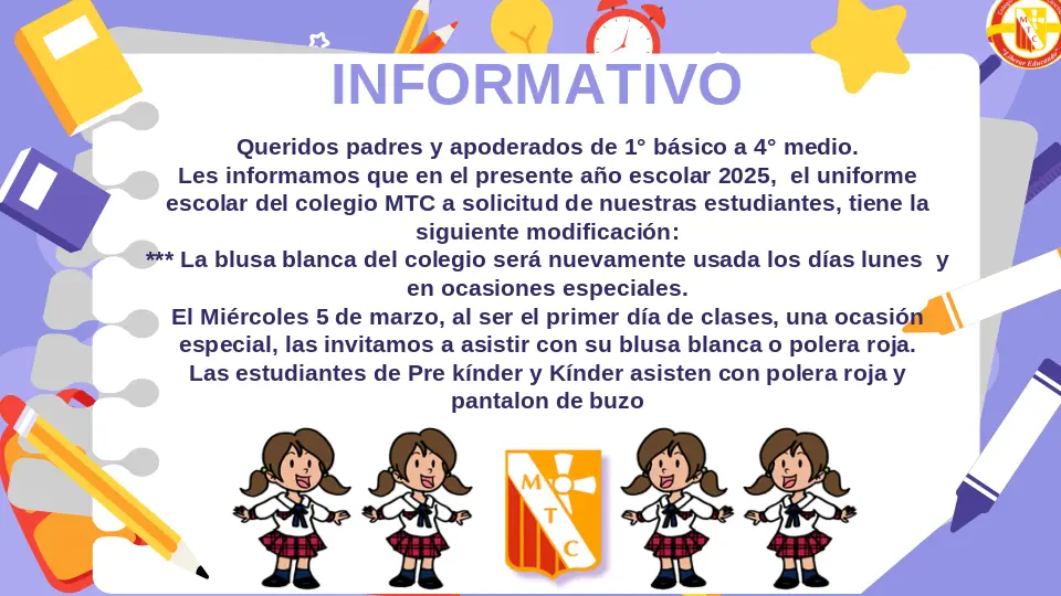 Queridos padres y apoderados de 1° básico a 4° medio.Les informamos que en el presente año escolar 2025, el uniforme